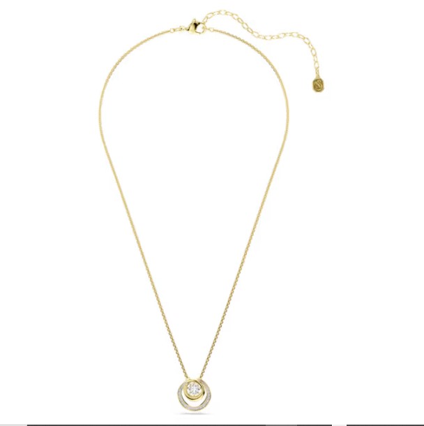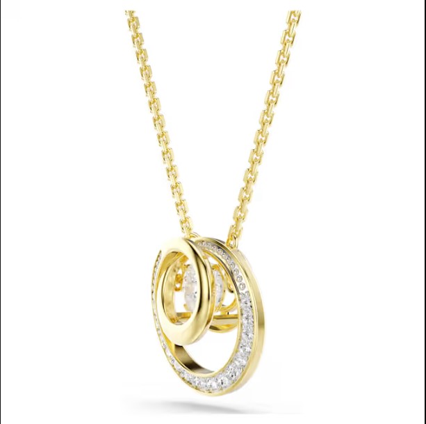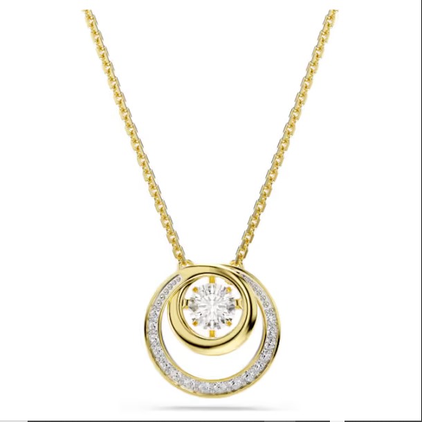 Este collar Hyperbola, que desdibuja la línea entre los estilos clásico y contemporáneo, es un accesorio con una silueta única. El diseño circular está bañado en oro y presenta una Dancing Stone central rodeada por un marco de cristales de distintos tamaños. Llévalo con pendientes o un anillo a juego para enfatizar el look hipnótico.