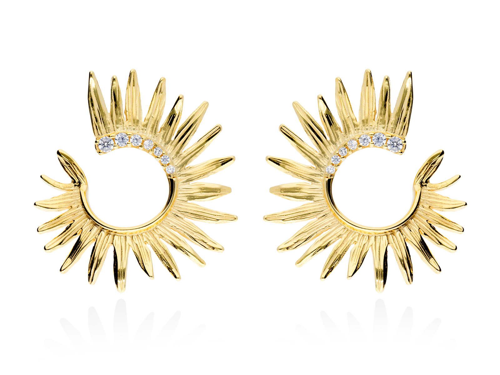 Pendientes inspirados en el Sol de la diseñadora Marina García. Fabricados en Plata de Primera Ley (925), circonitas y baño de oro o rodio. Llévalos el día de tu boda, como madrina o invitada, unos pendientes que no dejarán indiferente a nadie.