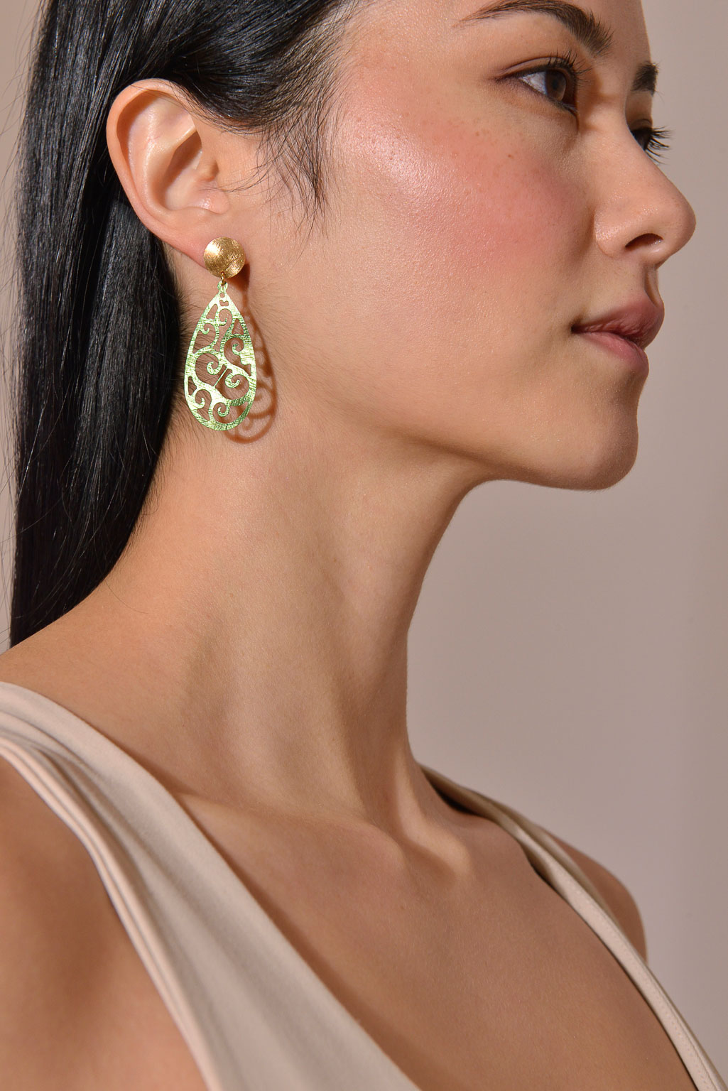 Pendientes de la colección Bamboo de Salvatore, en forma de pera con un diseño calado en filigrana. Fabricados en Plata de Primera de Ley (925), baño de oro y esmalte verde.