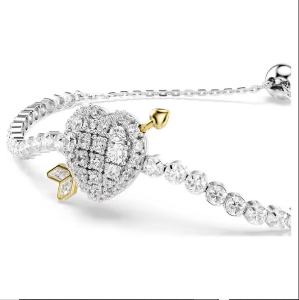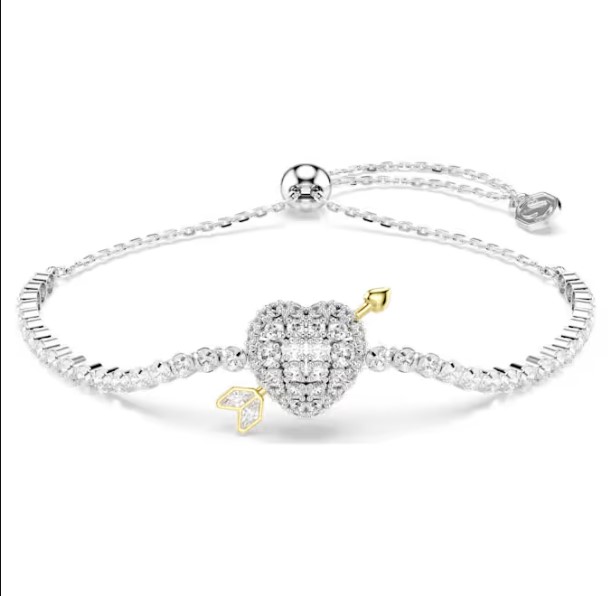 El amor verdadero se une a la luz radiante en esta pulsera de Swarovski de la familia Idyllia. La delicada cadena está adornada con cristales de talla redonda en un engaste bañado en rodio, mientras que en el centro, un brillante motivo de corazón es atravesado por la flecha de Cupido en tono oro. Ajusta el tamaño con el cierre deslizante y combina la pulsera con otros accesorios a juego de la misma colección, inspirada en el romance.