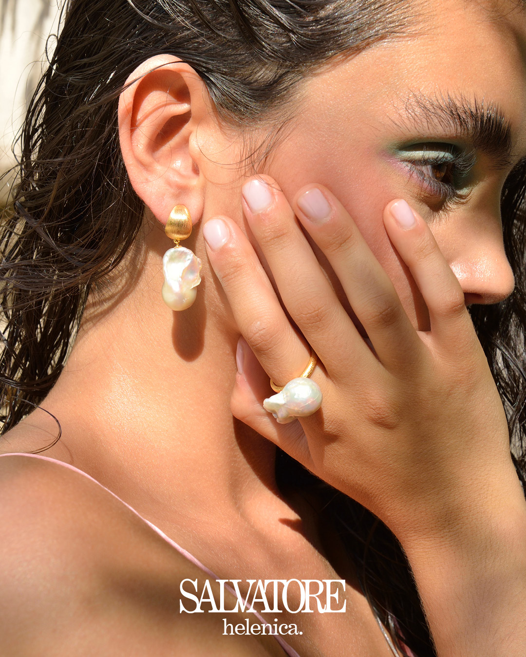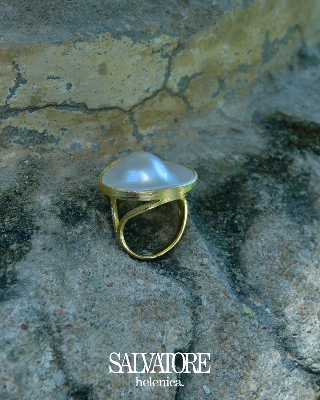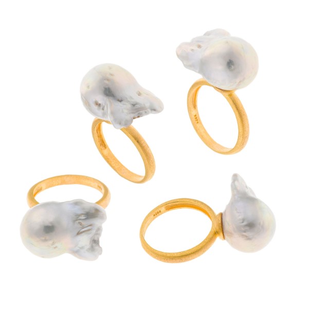 Sortija fabricada en Plata de Primera Ley (925) con baño de oro y una gran Perla Barroca cultivada como protagonista en el centro. Llévala sola o bien acompáñala con unos preciosos pendientes de la misma colección Helénica.