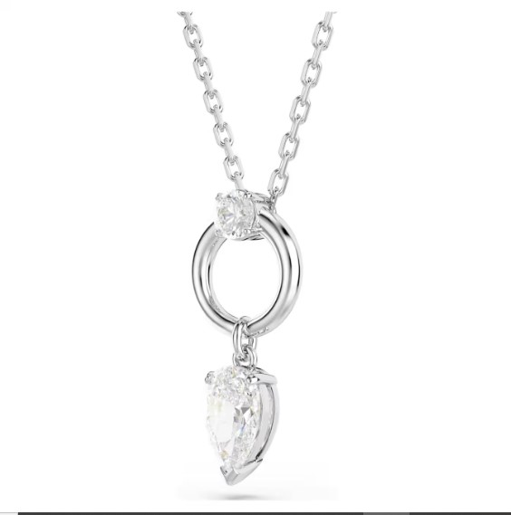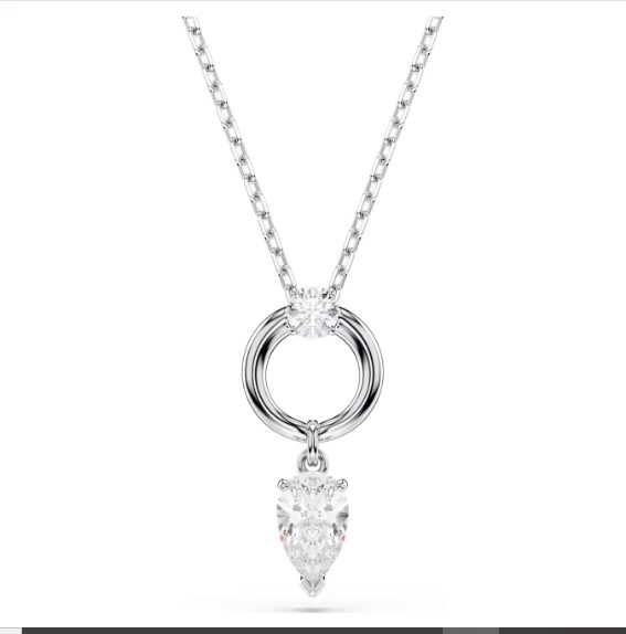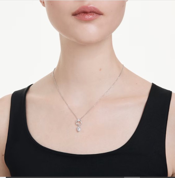 Este colgante Mesmera combina brillo con refinamiento para crear un llamativo accesorio para el día a día. El resplandeciente motivo presenta una circonita en talla de pera, unida a un lujoso aro bañado en rodio. Una circonita adicional de talla redonda se coloca en el centro, mientras que un mecanismo deslizante en la cadena permite ajustar fácilmente el colgante a la longitud deseada. Llévalo con los pendientes a juego para crear tu propio conjunto deslumbrante.